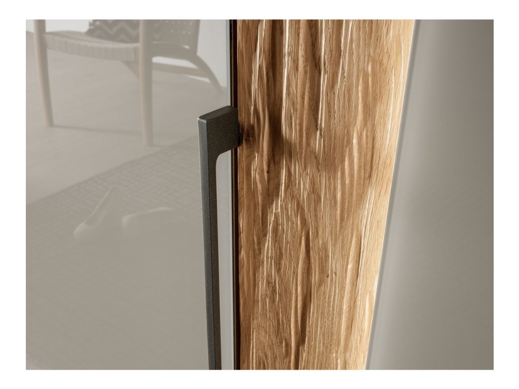 Sklo, MDF/kompozitní dřevo, masivní dřevo (akcent), kovové kování